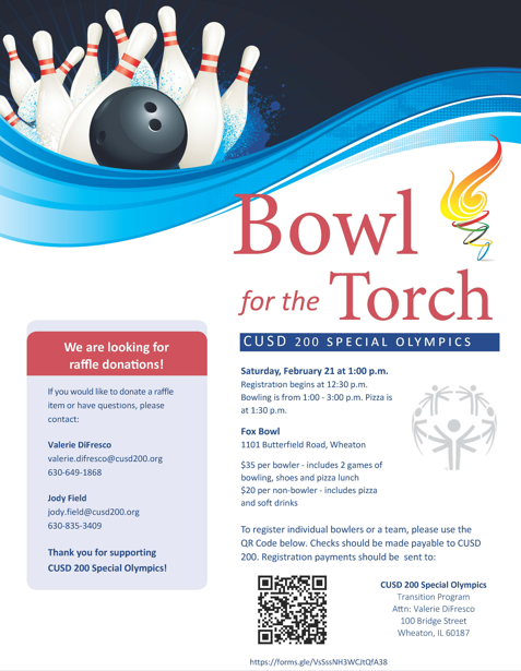 CUSD 200’s Special Olympics will once again be holding our biggest fundraiser, Bowl for the Torch. Join us on Saturday, February 21st from 1:00 P.M.-3:00 PM. Bowling and pizza will be $35 per person; this includes 2 games of bowling, shoes and pizza lunch. The cost is $20 per non-bowler; includes pizza and soft drinks.