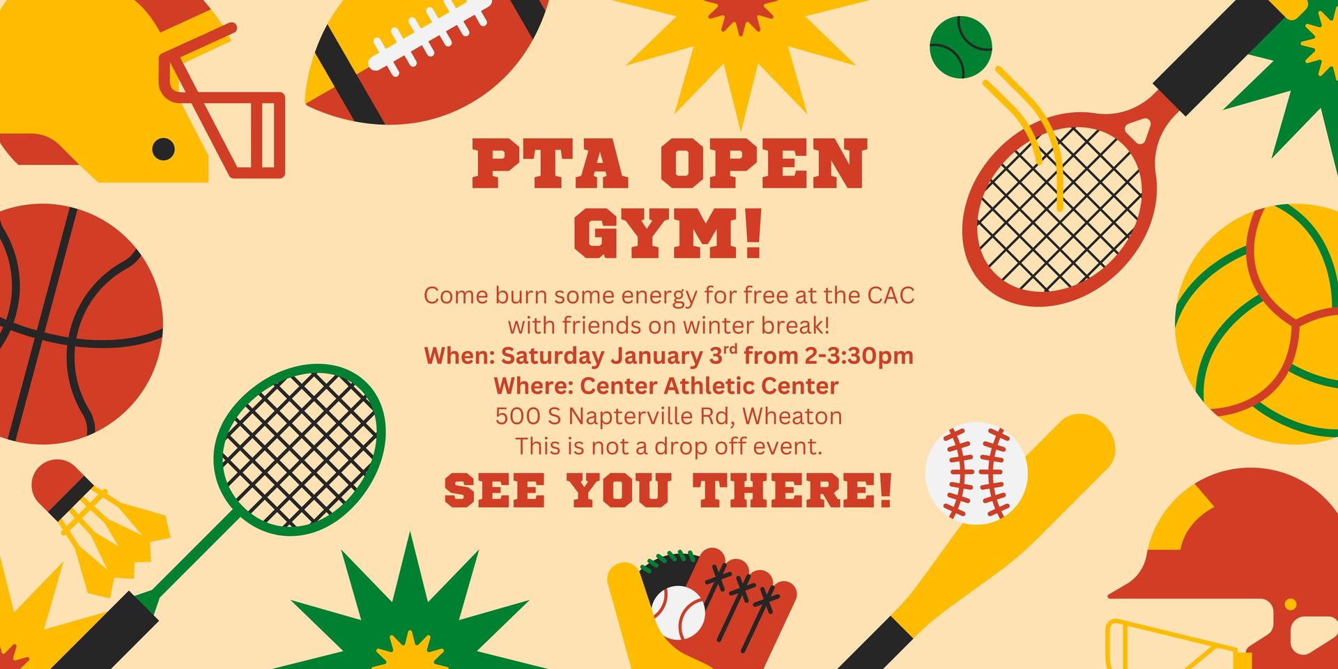 December 22-January 5: Winter Break January 3: PTA Open Gym @ CAC January 5: Teacher Institute Day