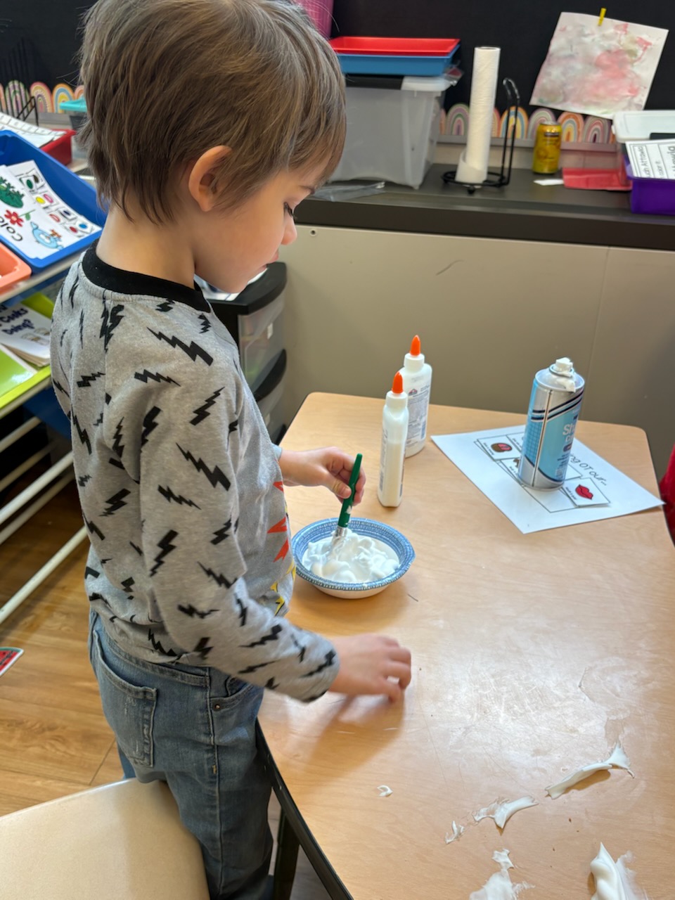 Today, our students participated in a fun and creative winter-themed occupational therapy lesson. They began by combining glue and shaving cream to create a textured base for a snowman. Next, students independently mixed the materials and painted their own snowman, practicing hand strength, coordination, and control. To finish, students decorated their snowmen using buttons, hats, eyes, and glitter—an activity that required careful use of fine motor skills, creativity, and attention to detail.