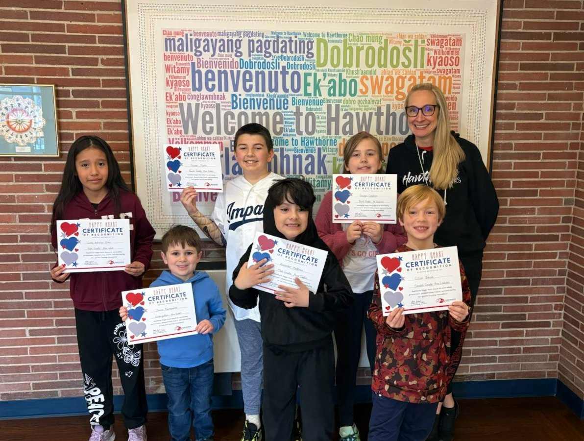The Happy Heart Award is a recognition ticket given to students who go above and beyond to demonstrate the Hawthorne Way during the school day. Students who earn this will receive a ticket with their name on it, the staff member who recognized them, and the reason they were recognized. The recognition portion will go home to celebrate with family.