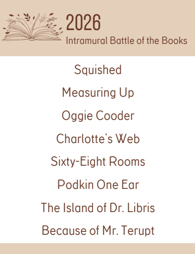 The Intramural Battle of the Books season will soon be underway. If you are not familiar with IM Battle of the Books, it is a fun and competitive way to spend your time this spring. Students are broken into teams, are assigned reading and come to an assembly style battle in May to answer questions related to their reading, Jeopardy style. Look for permission slips in your child’s take-home folder. |