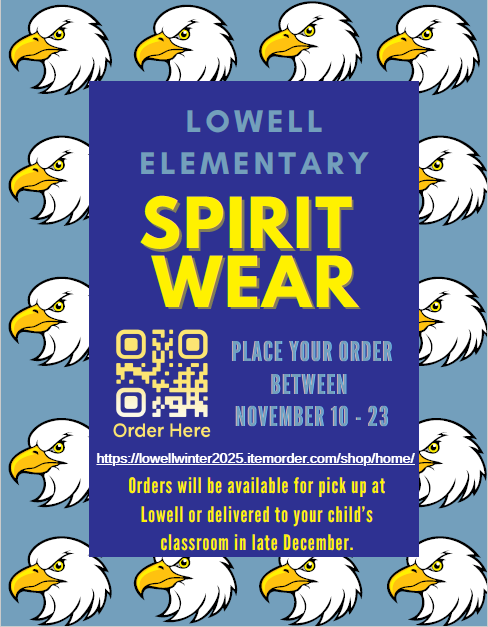 The PTA is excited to announce that our online Spirit Wear Shop is now open! You’re invited to show your school pride and order any of the following: long sleeve Lowell Eagles shirt, short sleeve performance shirt, and/or car magnets. You can place your order through November 23rd: