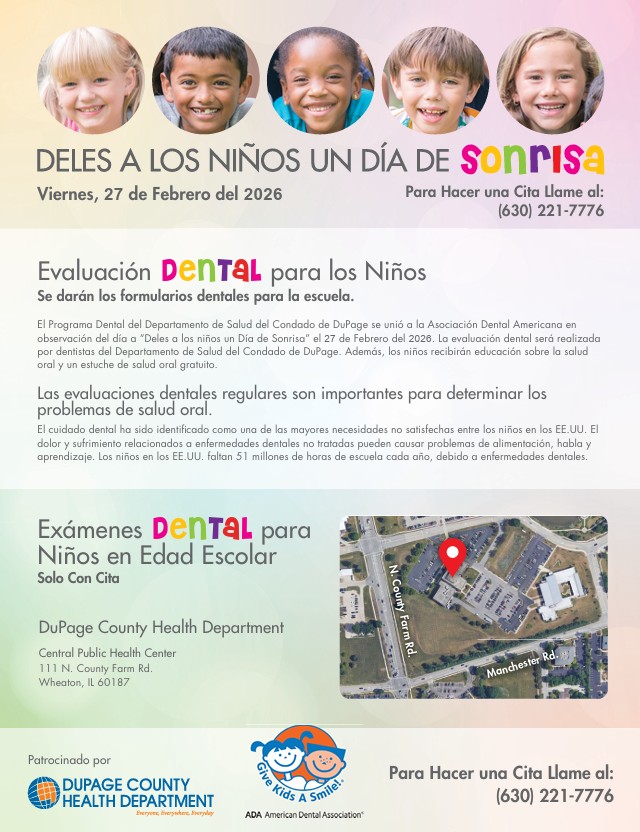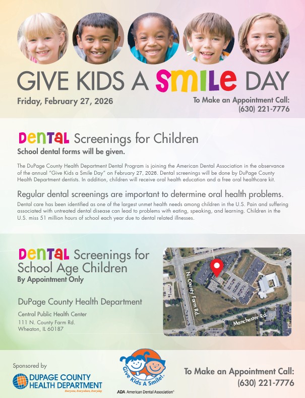 DuPage County Health Department Dental Program is joining the American Dental Association in observance of "Give Kids a Smile Day" on Friday February 27th . Free dental screenings will be done by DuPage County Health Department dentists. Children will receive a School Dental Exam form, oral health education and an oral healthcare kit. This event is by appointment only. Please call 630-221-7776 to make an appointment. |