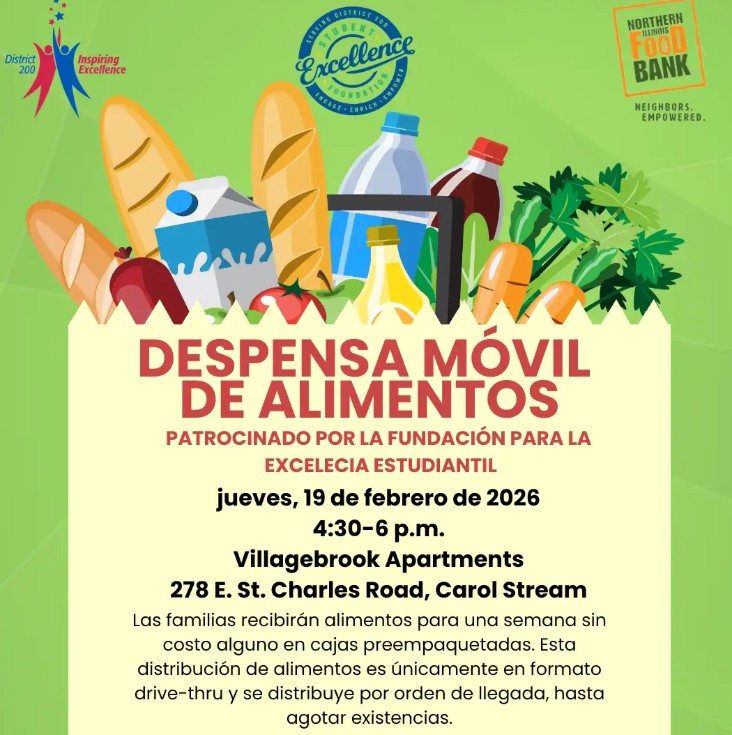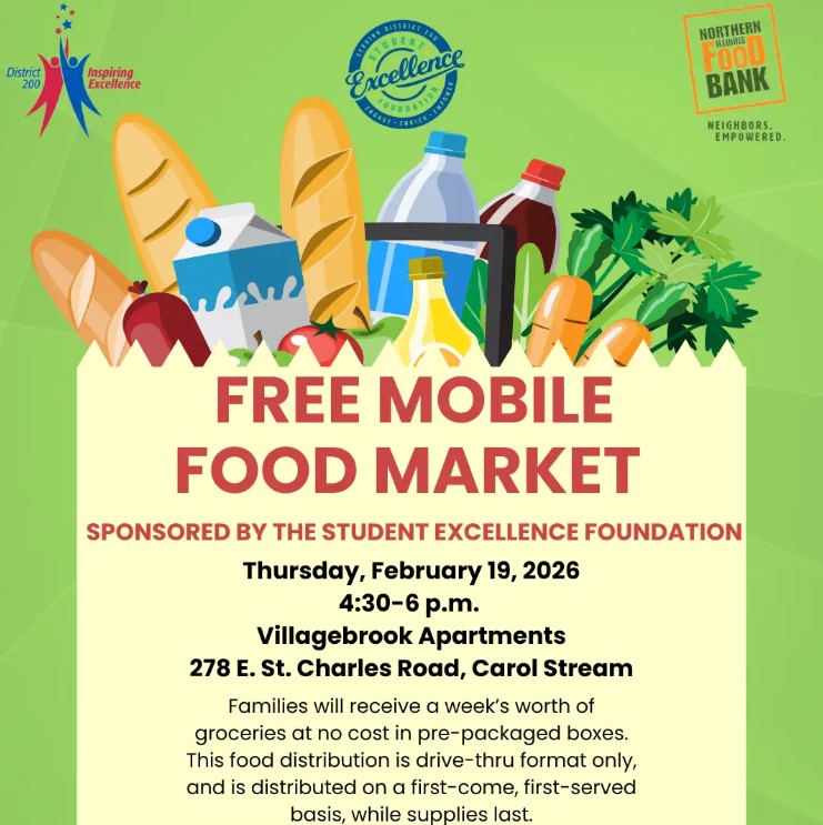 There is a free mobile food market Thursday, February 19, from 4:30 - 6:00 p.m. at Villagebrook Apartments located at 278 E St Charles Rd, in Carol Stream.