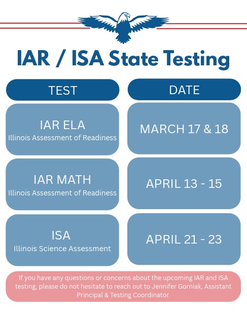 3. IAR Testing is coming up in March & April. Check out the graphic below for specific testing dates. Upcoming Events 2/17: BVB Home, GBB @ Glen Crest 2/20: Band Step Up Day 2/21: Bowl for the Torch 2/23: 6th Grade Cyberbullying Presentations w/ WPD, GBB Home, BVB @ Glenside 2/24: Winter Play 3:15-4:15pm, GBB Home, BVB @ Hubble